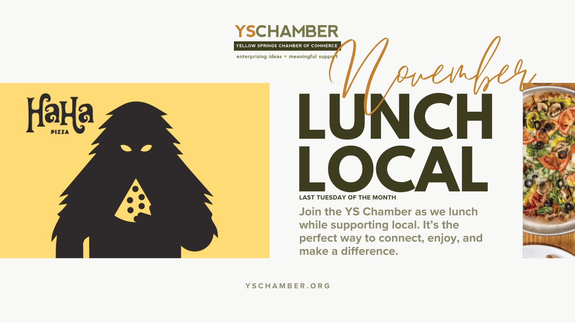 Let's take a break together! Join the YS Chamber Member Network for a fun, casual lunch at HaHa Pizza with flatscreens, great food, and electric atmosphere.