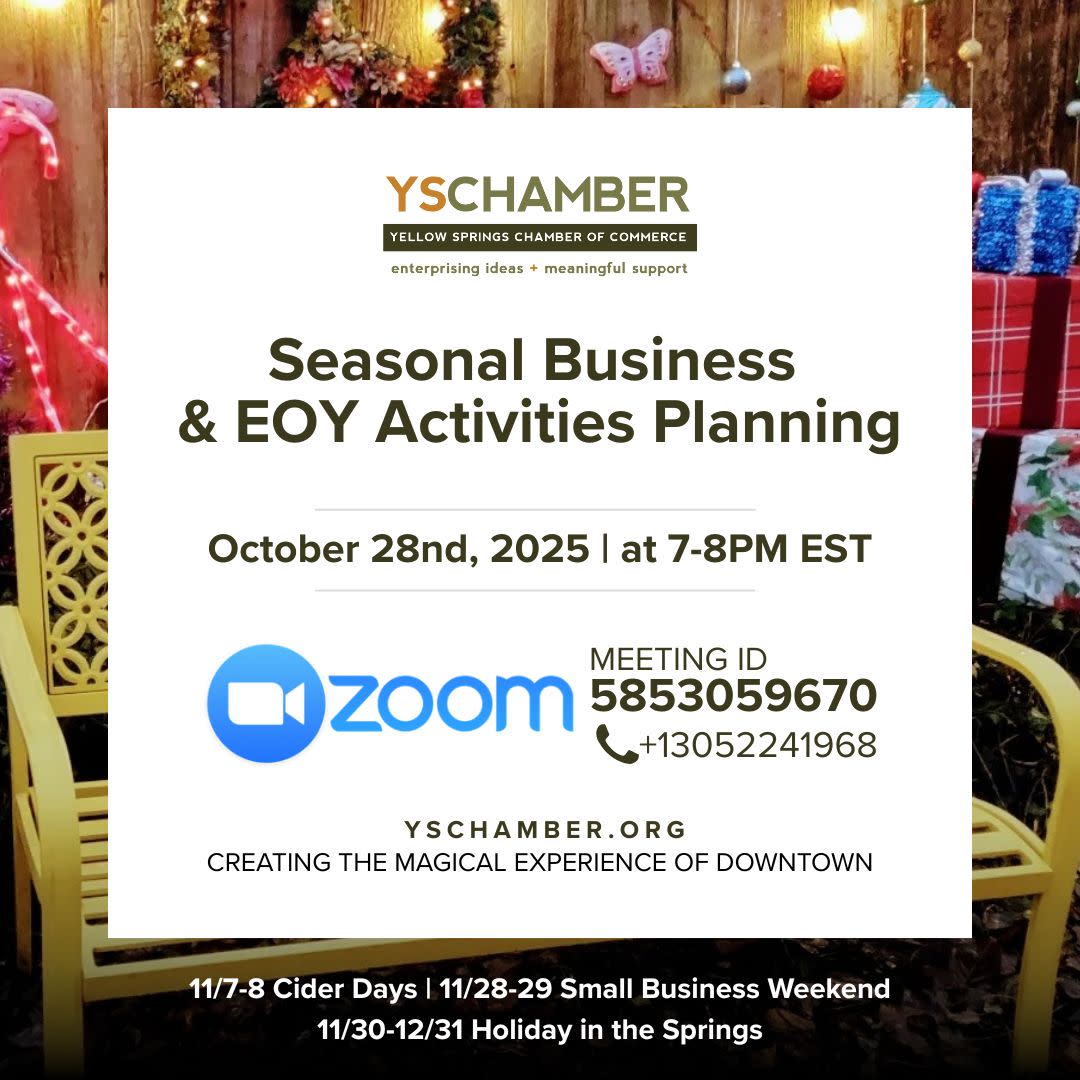 Please bring your thoughts, ideas, and calendars as we discuss the magical experience in Downtown Yellow Springs this season. Your input and participation help create the moments we will all share during these final months of 2025.